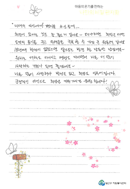 [‘나비함 비밀친구’의 답장] (편지 원문)   ‘미래의 자신에게’ 편지를 쓰신 분께.... 희망이 있다는 것은 참 좋은 것 같아요~~ 왜냐하면 희망은 어떤 도전의 용기를 주고 두려움을 극복할 수 있는 가장 큰 원동력 같아요. 18년째 발전이 없었으면 앞으로는 발전할 날들만 남았네요~ 원하는 대학도 다니시고 여행도 다니시면서 나를 더 많이 사랑하는 기회가 되면 좋겠네요~ 나를 많이 사랑해야 발전도 있고 희망도 이루어집니다. 긍정적인 마인드로 희망을 키워가시길 응원합니다! | |||||||