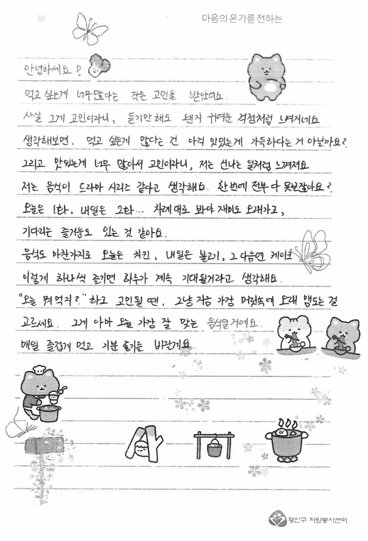 | 안녕하세요 광산구자원봉사센터입니다! 나비함에 남겨주신 소중한 마음들과 자원봉사자분들의 따뜻한 진심을 모아 나비함 비밀친구 활동을 진행하였습니다.보내주신 편지들 중 주소가 기입되어 있지 않은 편지의 답장을 올려드립니다